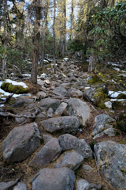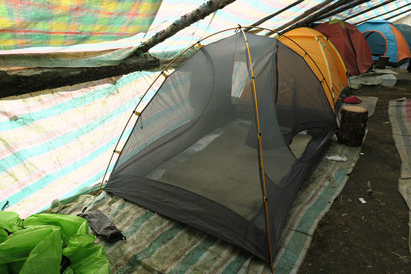 路就不说了,后来坡很陡,走十几二十几步路就得歇会,主要是高海拔,有点呼吸困难,我辈的包有近30斤重,感觉比徒步牛背山吃力些,毕竟牛背山最高处才3600米,而我们这是从3600起步往上爬。但还好,我几乎一直走在前面,说明我体力还行!我想说的是这次最遭罪的地方是我们住的地方是个四面透风的大帐篷,只能挡点风,温度其实和外面一样,而我和王大哥上去的有点晚,领到的帐篷是夏季帐篷,连防风群都没有,并且没有防潮垫,只给我们铺了一个被子,而晚上的温度在零度以下(早上看到湖面已结冰),我的睡袋抗寒情况应该是零度,但这应该是三季帐篷的情况下,我想再要个被子,回答曰:没有了!当时我还没觉得怎样,喝了二两装小瓶酒只想早点睡觉,但是太冷了,根本睡不着,在睡袋里我除了打哆嗦就是筛糠,再就是翻饼烙饼。按常理,穿的越少暖的越快,但是睡袋不够保暖和外部温度很低的情况下我只能把所有的衣服全都穿上,袜子都套了两双。原本打算拍星轨的,可我也只能坚持了一会拍了下星空,真后悔没带羽绒服,还有就是酒带少了。这一宿我基本没睡,只在天快亮时咪了一会,还是睡袋终于被我捂暖了以后。那一个晚上我终于领略了什么叫熬日子的苦和盼天明的心切!其实那晚许多人都没怎么睡,都在盼天明,早上起来还有几个人在吐,可他(她)们是因为高反,而我,是因为活活被冻的才没法睡,这是我一生中住的最遭罪的一个夜晚!但我依然,无怨无悔!
