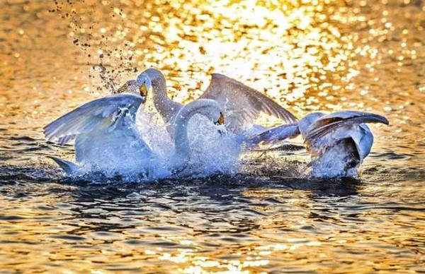 在山东省荣成市俚岛镇(山东半岛最东端),有一个依山傍海、景色秀丽的小渔村叫烟墩角,千里海岸湾岬相连,生态环境甚好,每年这个时候,成千上万只野生的大天鹅从遥远的西伯利亚、贝加尔湖、新疆和内蒙成群飞到这里的海湾和湖泊栖息越冬,这些海湾湖泊也就是人们常说的荣成天鹅湖了,烟墩角天鹅湖就是其中之一,因此小渔村便有了“天鹅村”的美誉。这里也是中国最大的天鹅越冬栖息地、世界四大天鹅湖之一,被誉为“中国大天鹅之乡”。
