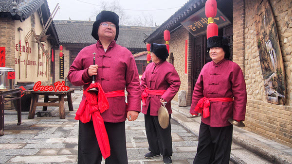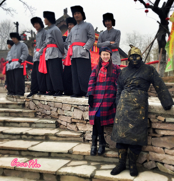 一直站在轿夫身下的铜人是初初来到民俗村就发现的惊喜,我凑上去观察了很久,铜人的妆发精致得以假乱真,只有眼睛里能看出一丝温度。尽管如此,他保持着高傲的职业素养,绝不在人前眨眼喘粗气,目视前方且纹丝不动,一时间让很多人信以为真。凑上去拍照,不敢靠近,生怕在按快门的瞬间,他望向我或是对我说话,那,我会瞬间崩溃。结果很遗憾,高傲如他,却望向了镜头,呈现出了和我合照的状态,破功!
