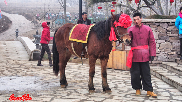 御马场距离民俗村步行十分钟,要不是对骑马一向由衷热爱,我宁愿在民俗村里和一众穿越的演员们多厮混流连一会。御马场在藏马山的高处,风大的几乎不能呼吸。此时演员们正在上演着《三国演义》的故事。