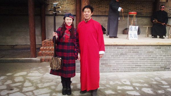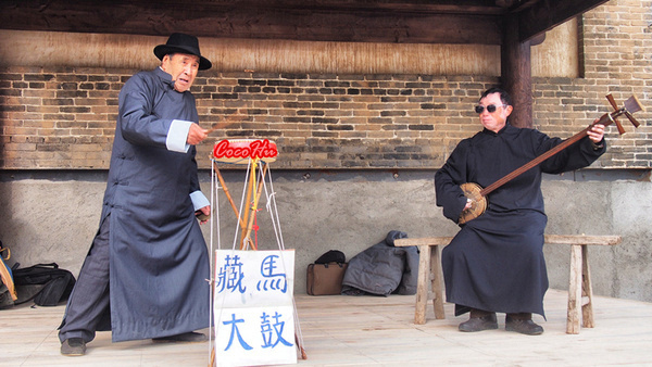 快板书的演出场地在主街的尽头,小小的亭子是民间艺人们的天地。穿着色彩鲜艳的大褂,敲着竹板,一次次地讲述着武松打虎的故事。当然,最吸引我的部分,正是中间坐着的这位三弦演奏者,他手持的大三弦,我第一次见到实物。我国的三弦分很多种类,我有一把从苏州带回来的苏州评弹小三弦,还有一把从冲绳带回来的冲绳三线,冲绳三线就是从我国小三弦来源的。弹三弦的老人操着东北话,1960年代开始学三弦的他,当时才20出头,一晃已近半个世纪。我手持的大三弦,长度令人咋舌。