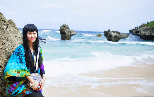 Coco怀抱冲绳三线,在冲绳古宇利岛(为方便对比大三弦和冲绳三线,特上此图)