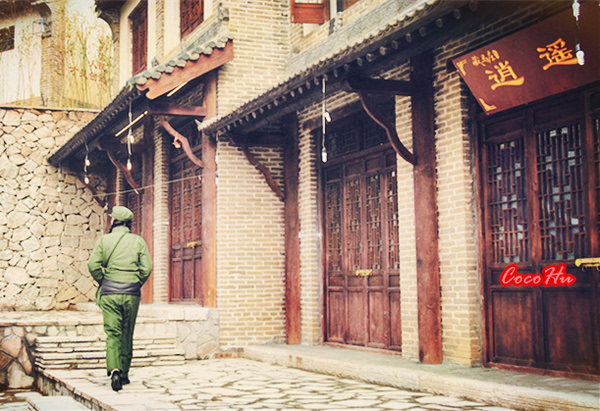 村口另一侧的铜人并没能如此敬业,站累了的他躲在“青岛小哥烧烤”的长椅上避风。青岛小哥显然并没能预见这位“不速之客”,两人互相对视许久不语,从远处看格外滑稽。小哥由始至终相当淡定,任由我在两人面前放肆地大笑了许久,等我停下笑声,大方地拍了拍他和铜人中间的位置,示意让我坐会。好吧,这张照片由此诞生,戏剧感穿越感十足。