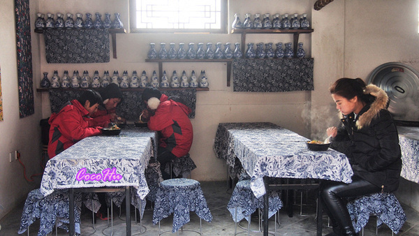 村里的热情,不但来自寒冬里热气热腾腾的食物,更来自缔造他们的厨师,做年糕的小哥一边唱着“天下第二也挺好”,一边翻动着手上的食物,并冷不防地用青岛话吆喝一声。尽管活跃如他,生意也并不如隔壁的煎饼果子好,谁让煎饼是山东名物呢,不尝尝,怎么舍得走出这欢乐洋溢的民俗村呢。