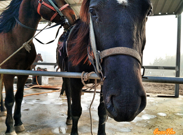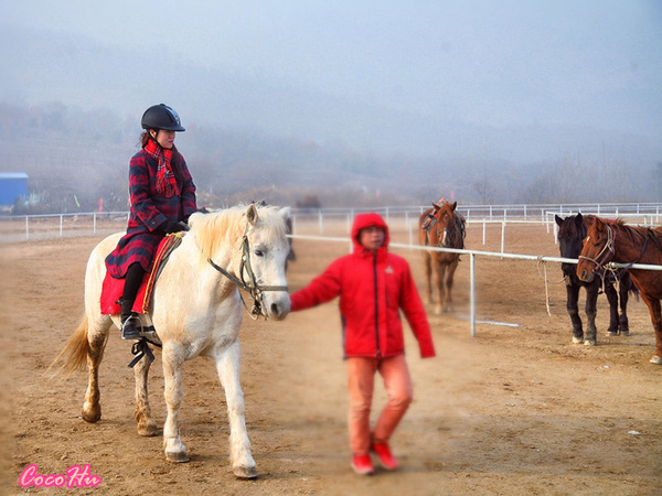 天气寒冷彻骨,风也吹得人睁不开眼,可来都来了,还是要试试这御马场的骏马。我骑的这白色骏马,在刚才的演出中也扮演着重要角色,一场演出下来,已经累得浑身湿透了,毛变得一条条贴在它身上,刚刚稍加休息就为我服务,真有些于心不忍。