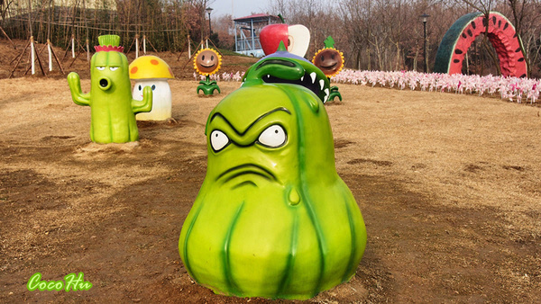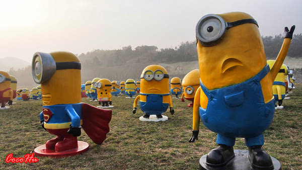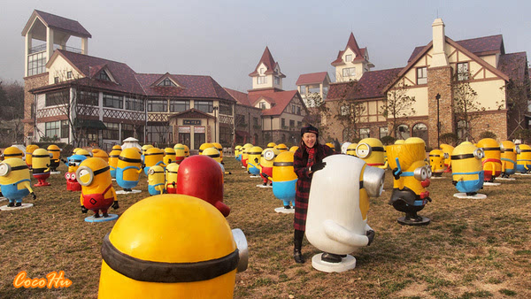 大片大片的小黄人,成了千嘻谷的招牌,因为人人都爱小黄人。这里有超人小黄人、蝙蝠侠小黄人、蓝精灵小黄人,一不小心又穿越了。我身后的欧洲小镇,是整个园区里的酒店和餐饮部所在——蓝莓小镇。蓝莓小镇里不仅有浪漫的建筑,在春暖花开时,真的有纯天然的蓝莓采摘。