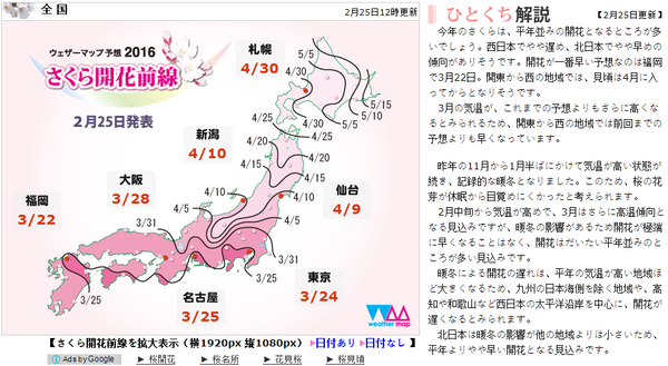 对于有计划前往日本赏樱的游客应该提前关注日本樱花气象地图网站,,被视为是权威预测的日本气象协会在2月初已经公布了日本2016年的樱花开花期预测,还有同样也很知名的Weathermap也在2月18日发表了新的开花期预测,例如大阪是3月底、东京是3月26日等等。